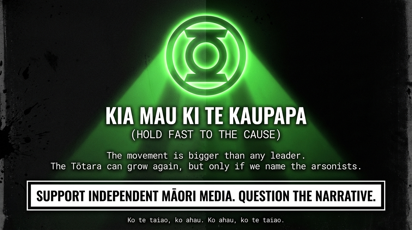 When a waka splits, whānau rebuild it. When a tōtara falls, the people plant another. Every koha to this kaupapa is a signal that whānau refuse to let colonial forces write the obituary of Māori political independence. It says: we will fund our own truth-tellers, because the Crown and its corporate media never will.