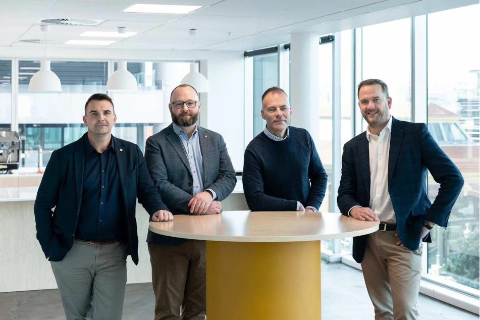 Four businessmen standing around a table in a modern office space, likely representing a corporate team or startup group.