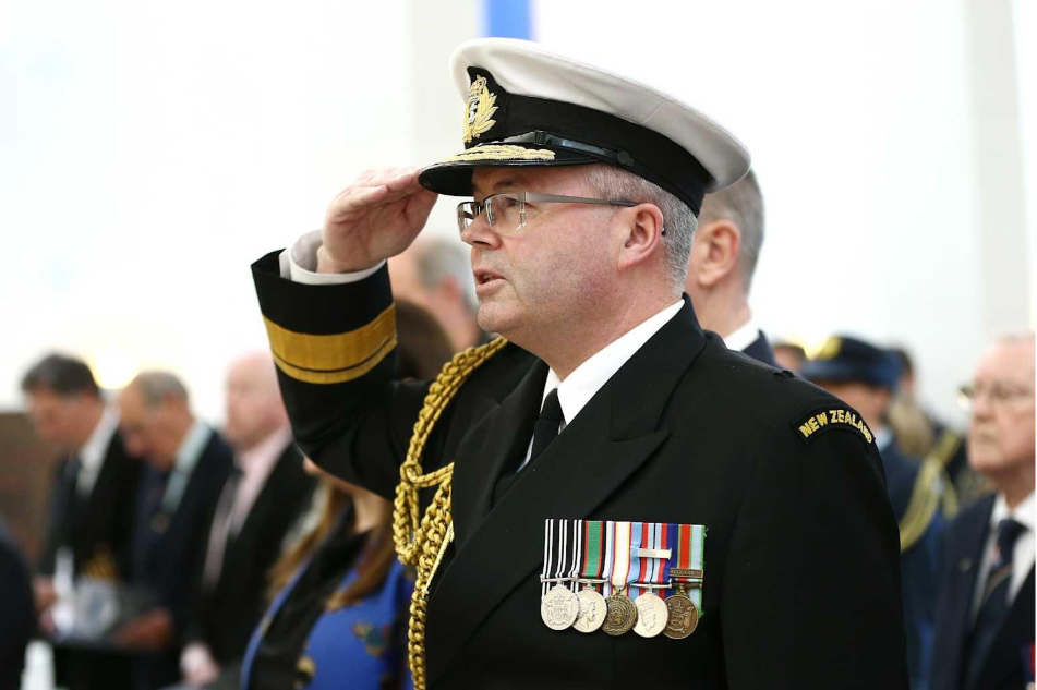Senior New Zealand naval officer saluting at an official event, representing leadership in NZ Defence Force maritime operations.