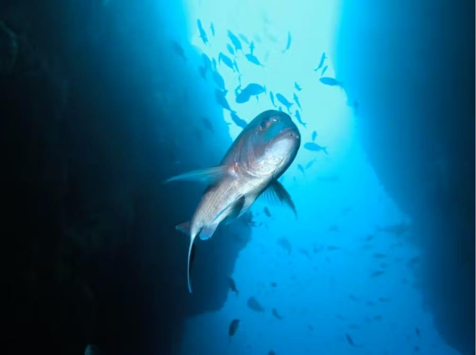 Underwater view of fish swimming through a rocky marine canyon illuminated by blue light.