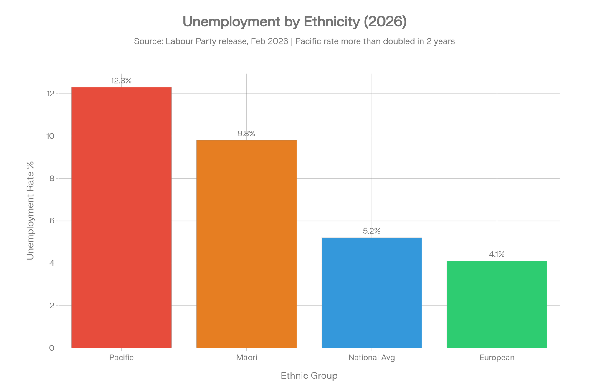 Connection 3 — The Employment Demolition: The government cut $22 million from Tupu Aotearoa — the primary employment support programme for Pacific New Zealanders. Pacific unemployment now sits at 12.3 percent — the highest of any ethnic group and more than double what it was two years ago. One in ten New Zealanders is Pacific. Luxon's Facebook says the Pacific "must be safe, secure, and prosperous." His budget says something different. As The Māori Green Lantern exposed in The Traffic Light Taiaha, this government has replaced support with a whipping post — and it beats hardest on brown bodies.