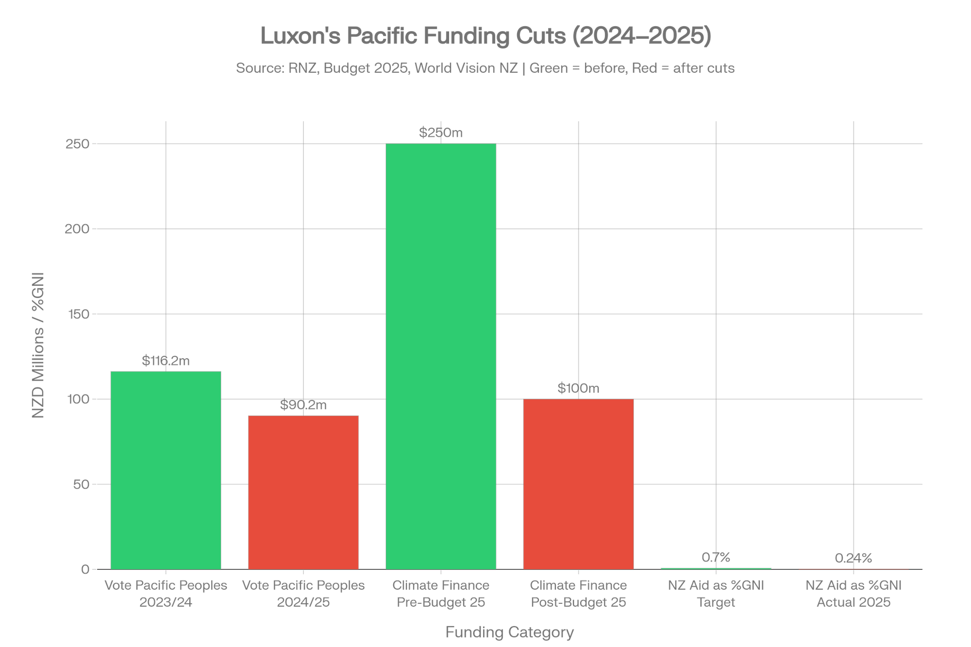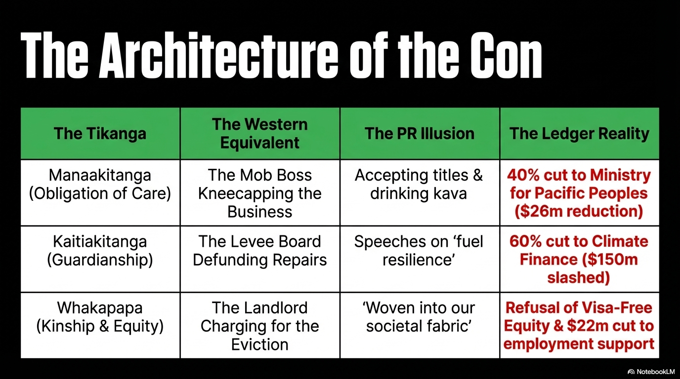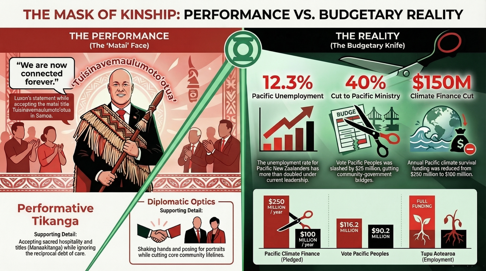 Connection 1 — The Performance and the Theft: While Luxon accepted a matai title symbolising guardianship and service to community, his Budget had already slashed Pacific climate finance by $150 million annually. No title ceremony closes that gap. As World Vision stated directly, the government has "turned its back on the Pacific region."