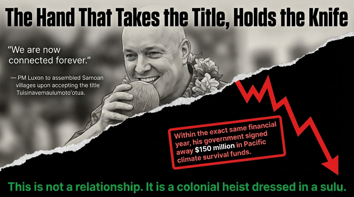 He accepted a chiefly title with one hand. With the other, he signed away $150 million that Pacific nations needed to survive the rising sea. This is not a relationship. This is a colonial heist dressed in a sulu.