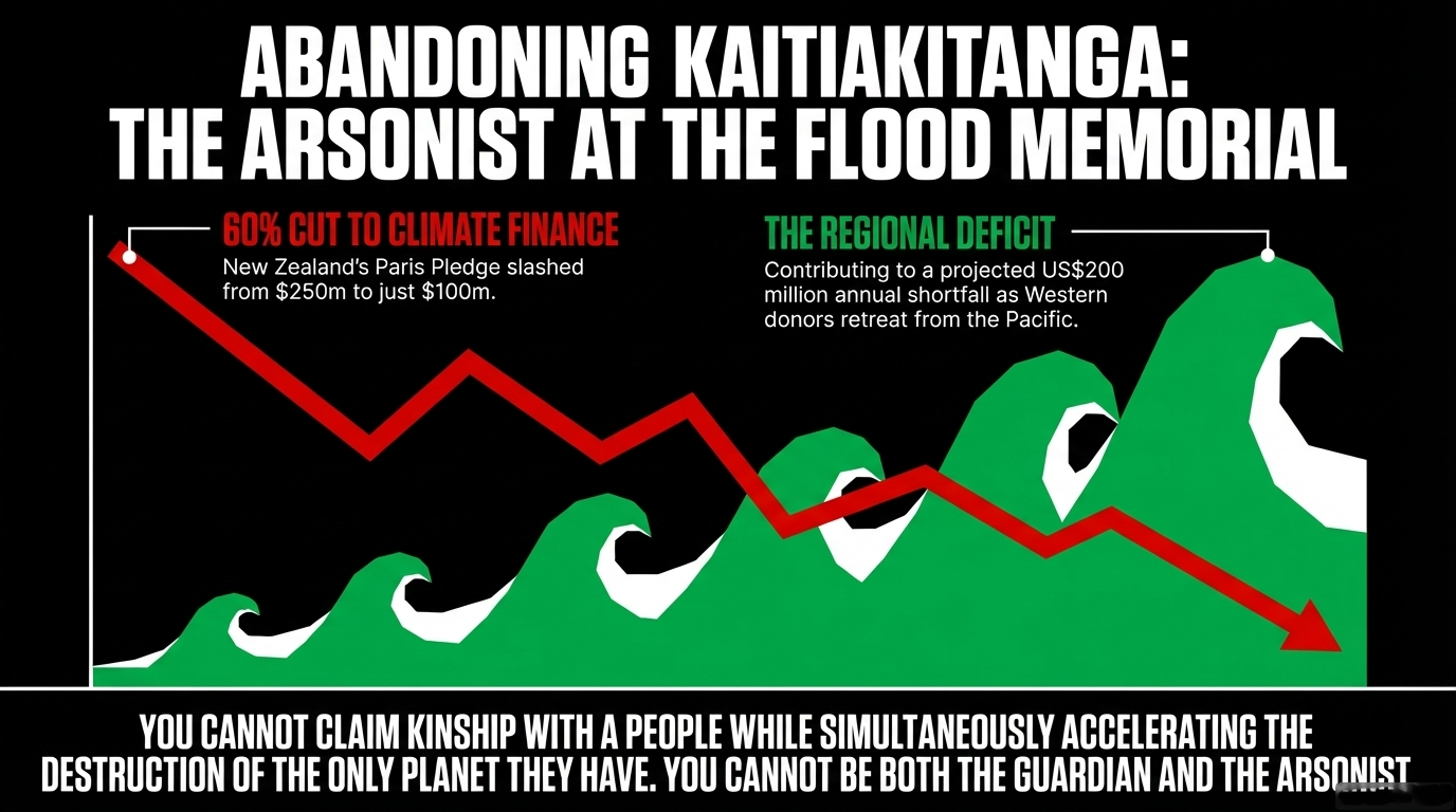 Kaitiakitanga means you do not get to claim kinship with a people and simultaneously accelerate the destruction of the only planet they have. You cannot be both the guardian and the arsonist. The solution: restore climate finance to $250 million, honour the Paris pledge, and extend it — as Caritas has demanded — with specific adaptation funding for Pacific nations now spending more on climate debt than on health or education.