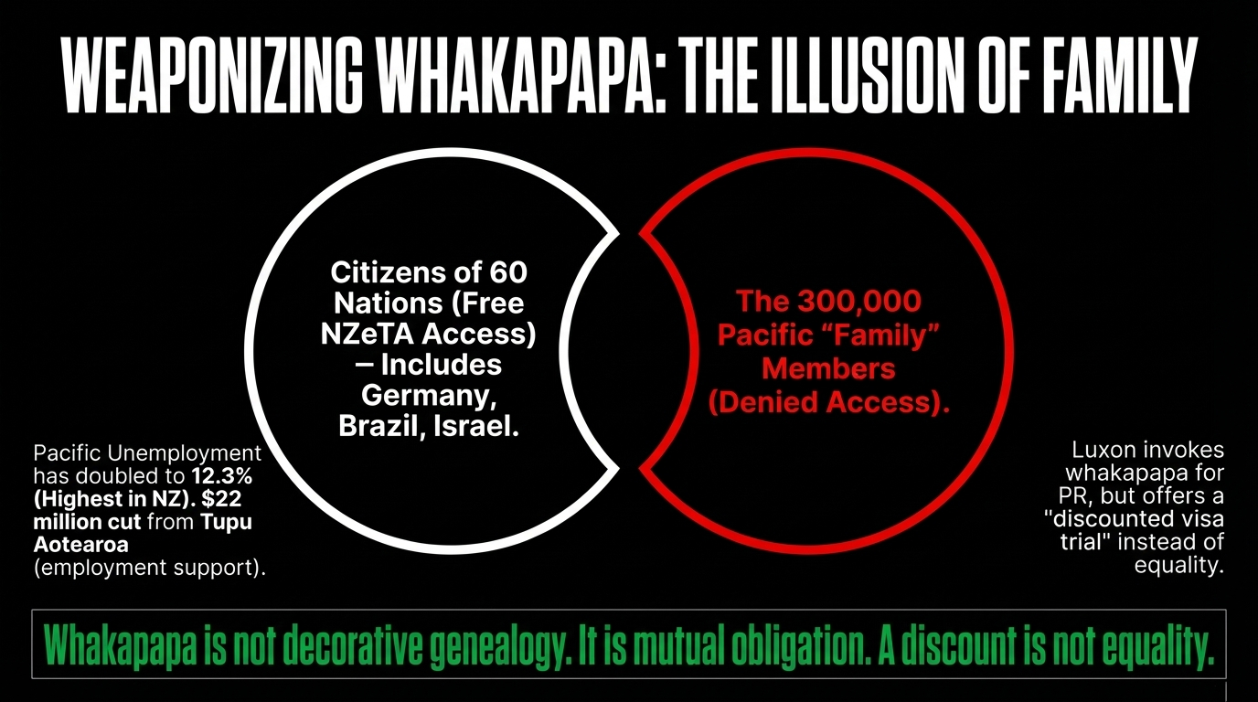 In whakapapa logic, you cannot claim relationship while simultaneously denying the terms of that relationship to the other party. Whakapapa is not decorative genealogy. It is a binding framework of mutual obligation. If Luxon genuinely believes Pacific people are family, then the visa barrier is a lie he tells himself in the mirror every morning. The solution is surgical and immediate: extend NZeTA access to all Pacific Island Forum nations without delay. Not a trial. Not a discount. Equality.