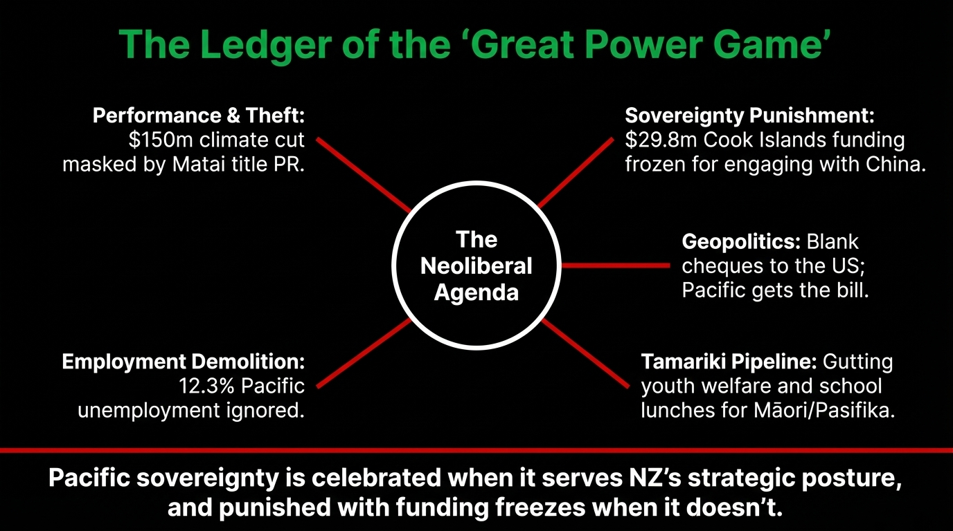 Connection 5 — The Great Power Game: While Luxon froze Cook Islands funding over China agreements, he simultaneously flew to meet President Xi Jinping in Beijing in mid-2025, as 1News reported. New Zealand's "Pacific family" relationships are, in the cold architecture of Luxon's foreign policy, instruments of great power competition — not genuine care. When Pacific sovereignty serves New Zealand's strategic posture, it is celebrated. When it doesn't, it is punished with a funding freeze. As The Māori Green Lantern exposed in The Tongue That Feeds the Beast: Luxon gave America a blank cheque drawn on Māori blood. The Pacific gets the same currency — performance, photo opportunities, and the bill.