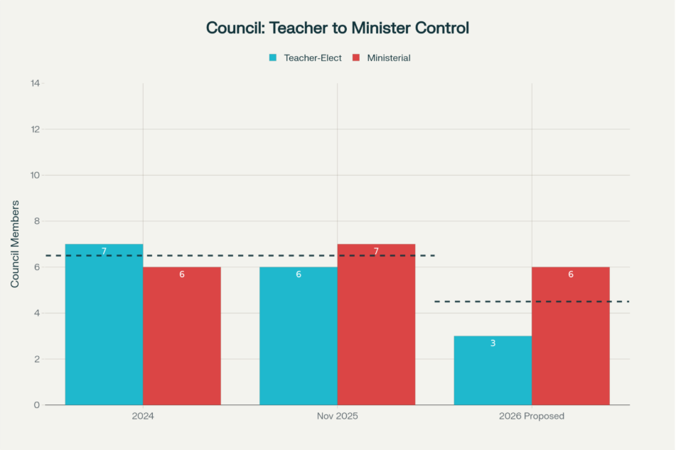 Education Minister Erica Stanford systematically stripped teachers of control over their own profession. The Teaching Council, which sets professional standards and teacher education requirements, shifted from 7 teacher-elected members (majority) in 2024 to just 3 by 2026, while ministerial appointees increased from 6 to 6-9 members—flipping democratic control to political control.