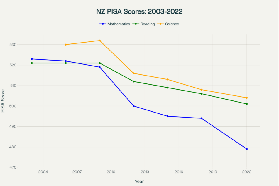New Zealand’s PISA scores show consistent decline across all subjects from 2003-2022, with mathematics dropping 44 points (equivalent to 1.5 years of schooling) and reading falling 28 points. The 2022 results were likely inflated by approximately 10 points due to only 72% school participation, below the 85% OECD benchmark.