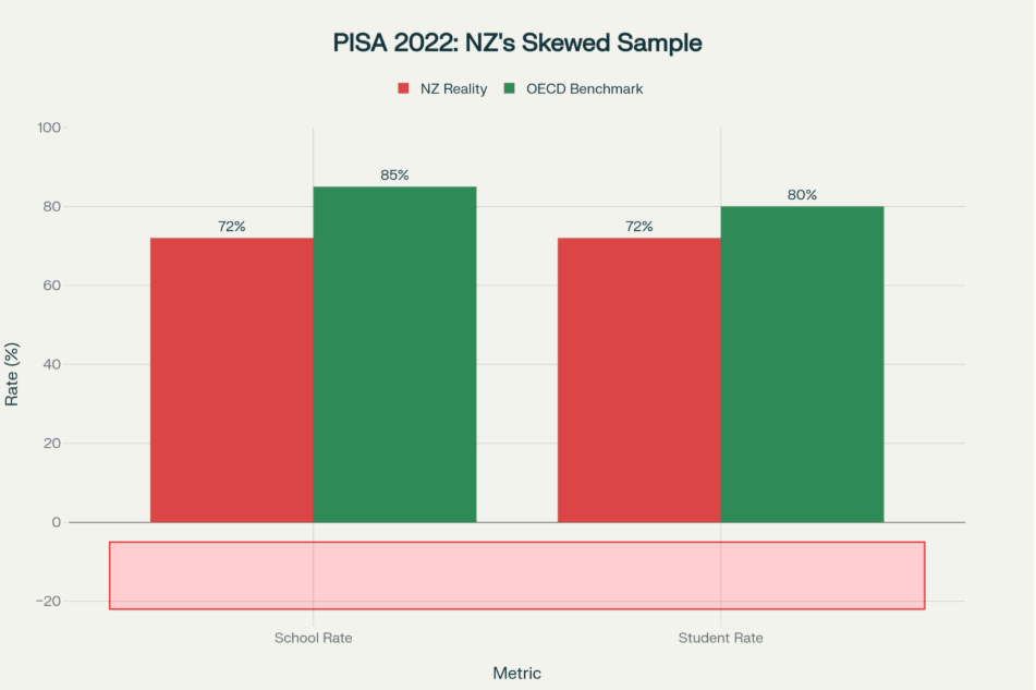 New Zealand’s PISA 2022 results are fundamentally flawed. Only 72% of invited schools and students participated—falling short of the 85% school and 80% student benchmarks set by OECD. High-decile schools were over-represented while low-decile schools under-participated, likely inflating scores by approximately 10 points. The government uses these corrupted numbers to justify centralizing control.