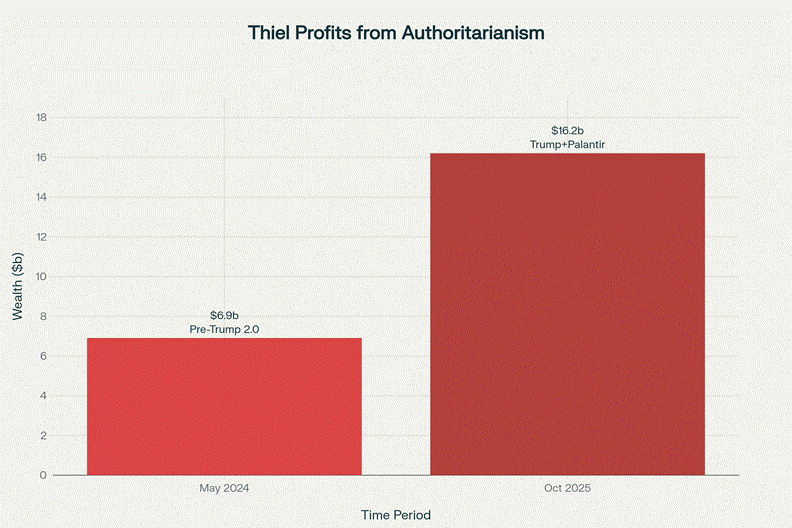 Blood Money: Peter Thiel’s wealth more than doubled to $16.2 billion as Palantir secured massive government contracts under Trump 2.0, profiting from surveillance, deportation, and the Gaza genocide