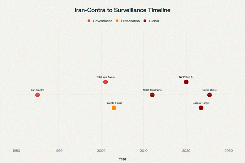 From Iran-Contra to Global Surveillance: The Thielverse Timeline showing how convicted criminal John Poindexter’s illegal surveillance schemes were privatized by Peter Thiel into a global empire of algorithmic violence