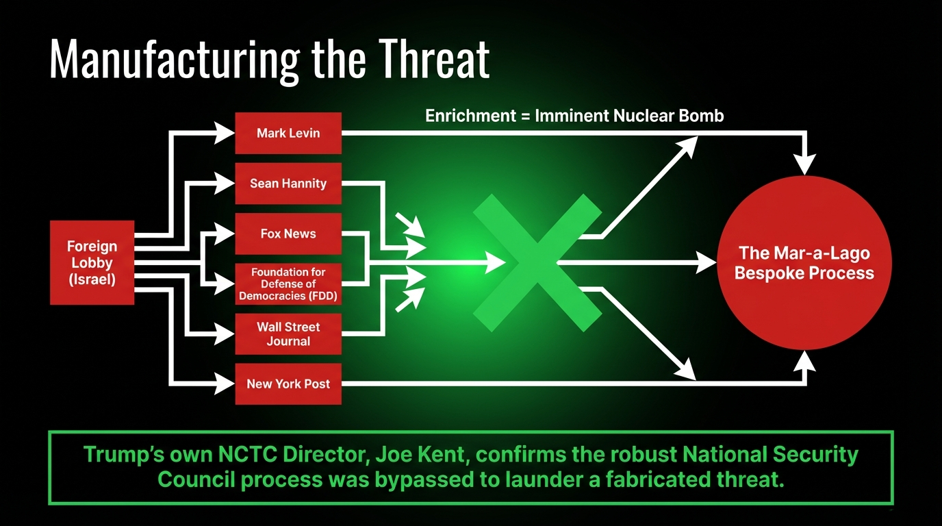 Kent named the mechanism with the precision of a man who spent his career inside it. In his Breaking Points interview, he described a coordinated Israeli influence operation: foreign officials entering US intelligence channels and coordinating with Mark Levin, Sean Hannity, the Foundation for Defense of Democracies, Fox News, the Wall Street Journal, and the New York Post to flood Trump's information environment with a single manufactured message: enrichment equals nuclear bomb.