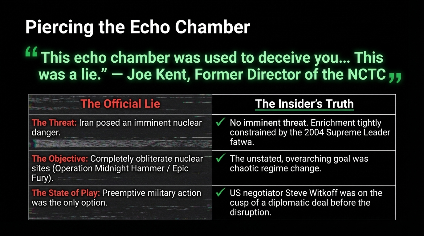 Joe Kent resigned rather than keep his hand on a machine built on lies. He walked away from power, from salary, from institutional protection — because some truths are more important than any position. He did that with the backing of eleven combat deployments and a Senate confirmation.