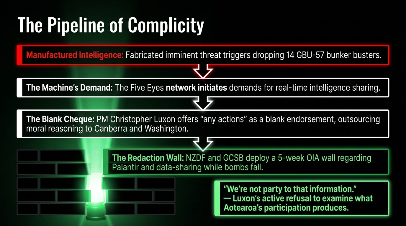 In short: a foreign government manufactured a threat, a media apparatus amplified it, a US president bypassed his own intelligence infrastructure to act on it, and the government of Aotearoa — bound by Five Eyes obligations, GCSB intelligence-sharing agreements, and a Prime Minister who offers "any actions" as a blank endorsement — became a silent participant in a war of choice.