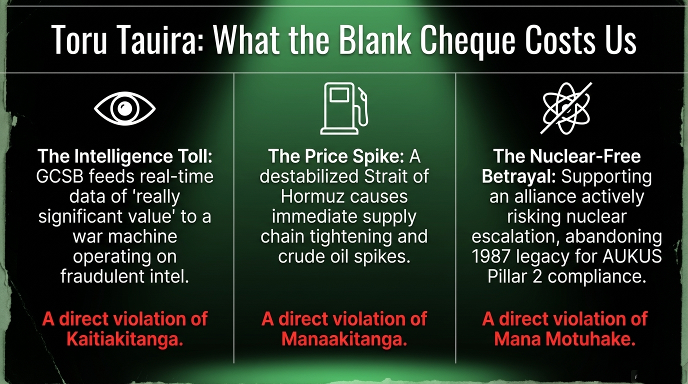 The tikanga impact: Mana motuhake — the right to self-determination, to act independently as a sovereign people — is not merely a Māori aspiration. It is what the nuclear-free movement built for this entire nation: Māori, Pākehā, Pasifika together. When Luxon says "we support any actions" without conditions, without questions, without access to the intelligence, he is not failing Māori alone. He is selling the mana motuhake that tangata Tiriti and tangata whenua built together over four decades. He is returning Aotearoa to the condition of the colony: obedient, incurious, useful. And he is doing it during a war that Trump's own spy chief has now confirmed was built on a manufactured lie.
