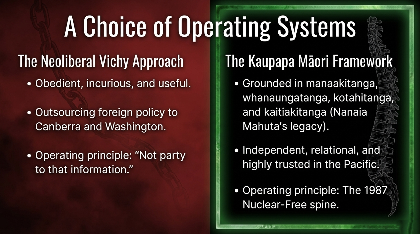 For the western mind: In 1987, New Zealand told Ronald Reagan — the most powerful man on earth — no. No nuclear vessels in our waters. No nuclear weapons on our soil. The Nuclear Free Zone, Disarmament, and Arms Control Act passed. We were frozen out of ANZUS for years as punishment. We took the diplomatic hit, the economic hit, the strategic isolation — because some principles are not negotiable. That was the moment Aotearoa became something distinct from the Anglo-American security complex — a nation with a spine and the scar tissue to prove it.