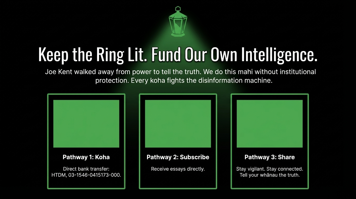 Every koha is an act of the same moral clarity Kent demonstrated: the decision that the truth matters more than the convenience of silence. Every koha signals that rangatiratanga includes the power to fund our own intelligence network — one that serves whānau, not empire. One that asks the questions that Luxon refuses to ask, names the networks that the media refuses to name, and traces the whakapapa that power hopes you will never see.