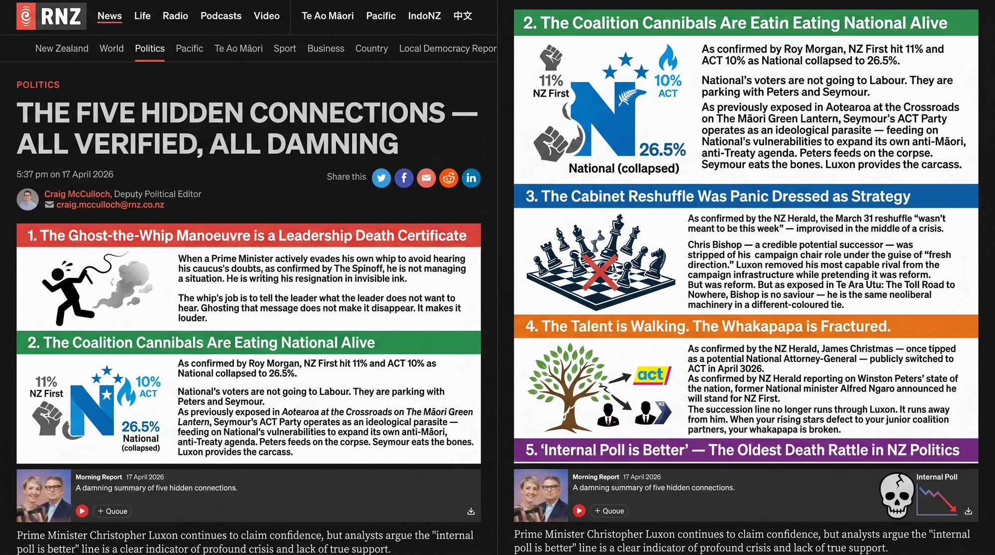 Luxon claims internal polling is "way better." As demolished by The Spinoff: "The poll goes to another school. And it lives in Canada." And as confirmed by The NZ Herald's Thomas Coughlan, Monday marks "the start of the toughest fortnight Luxon has faced as National leader." Every single leader dethroned in modern New Zealand history cited better internal numbers. Without exception. It is not a defence. It is a tell.