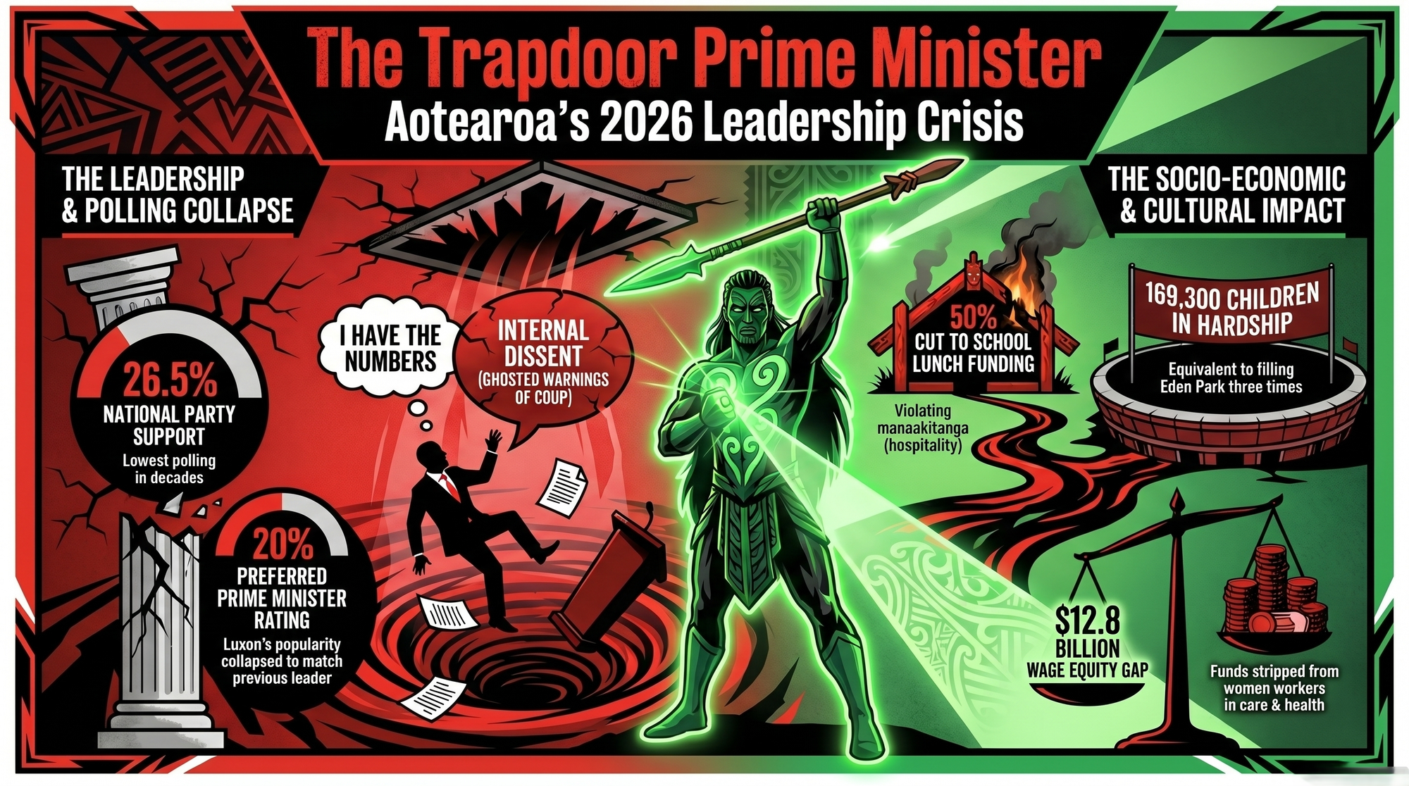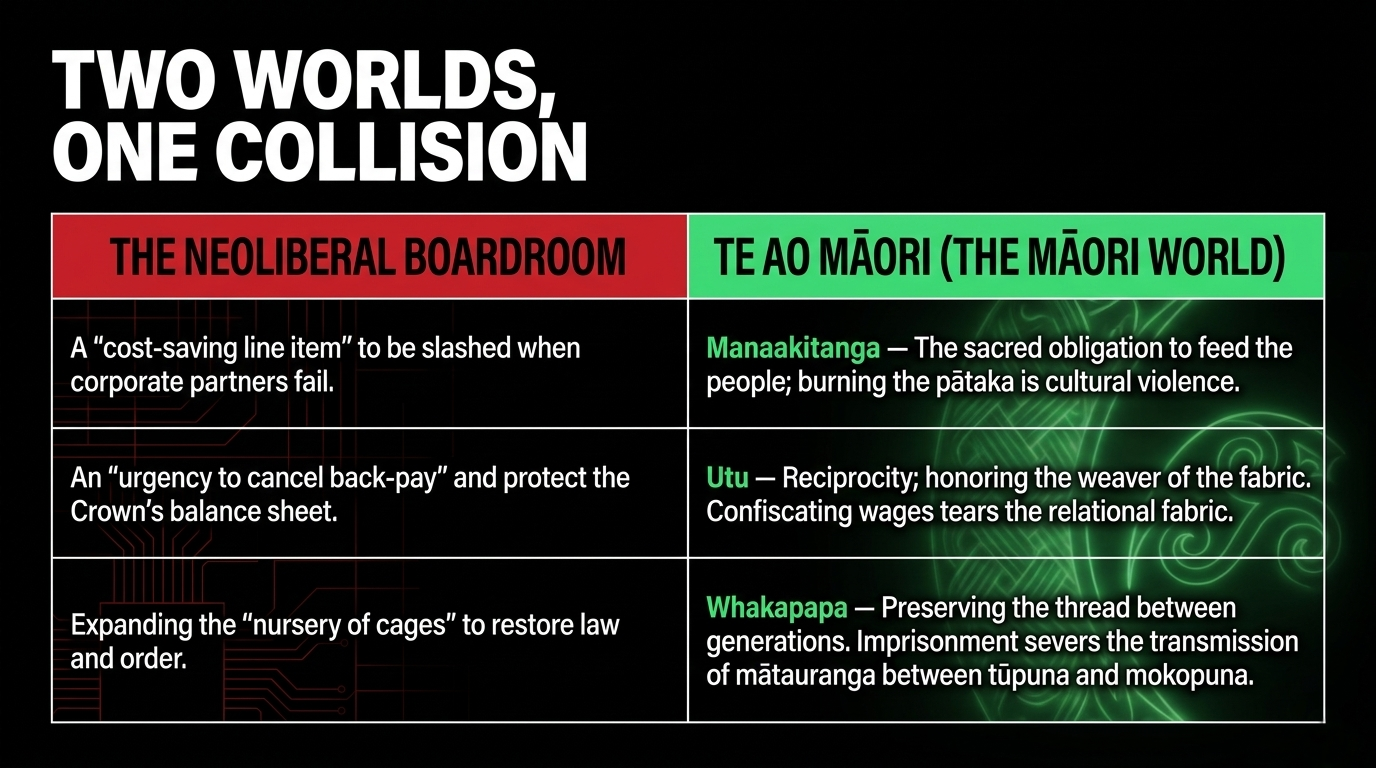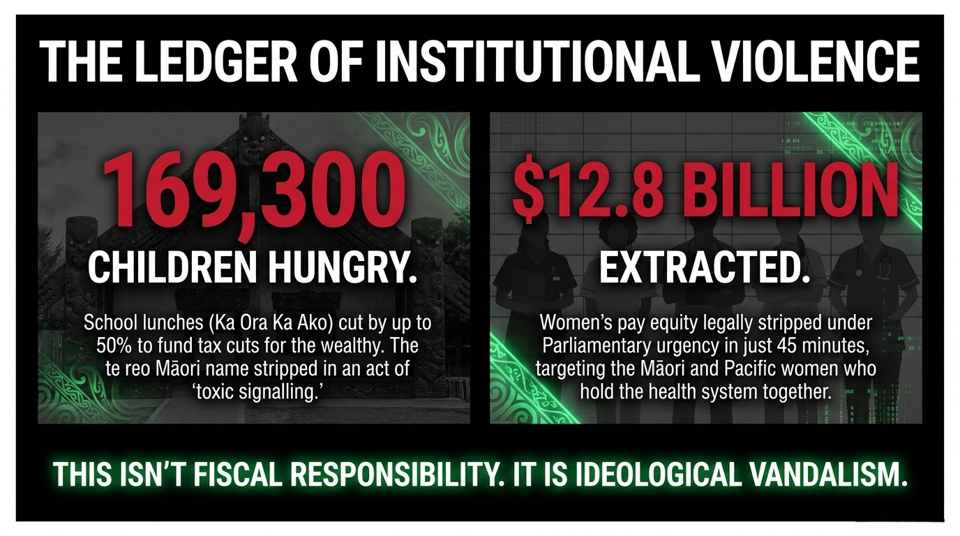 The tikanga impact: In te ao Māori, the pātaka — the food storehouse — embodies manaakitanga: the sacred obligation to feed those who come to you in need. When a rangatira burns the pātaka to save money, they are not being fiscally responsible. They are committing cultural violence against the community they were entrusted to protect. This government torched the pātaka. Then held a press conference. Then blamed the tamariki for being hungry.
