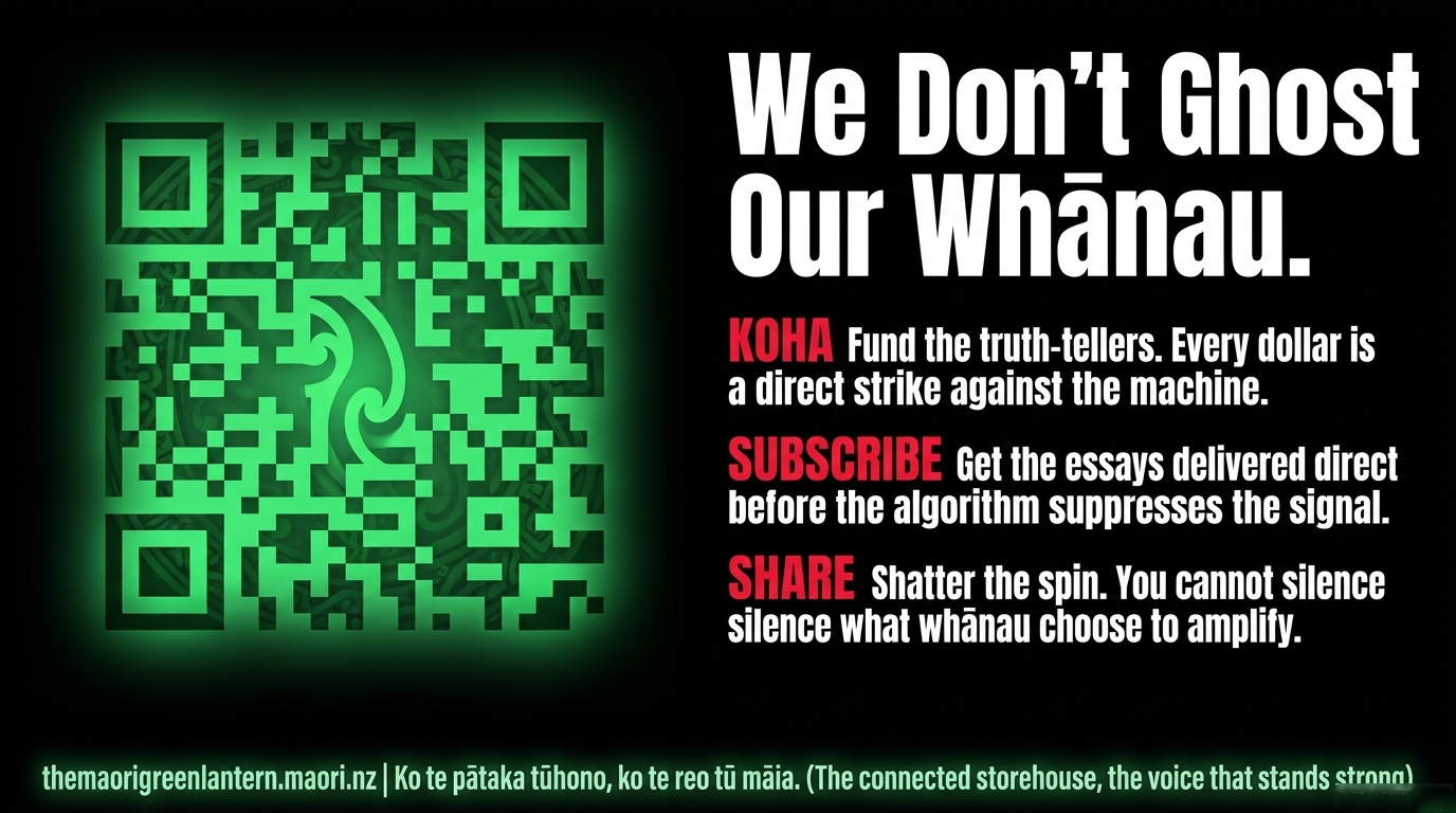 And if you cannot koha right now — no worries at all, whānau. Subscribe or follow at themaorigreenlantern.maori.nz. Share this essay. Talk about it with your whānau and friends. That kōrero is the koha. That conversation is rangatiratanga. You cannot silence what whānau choose to amplify.