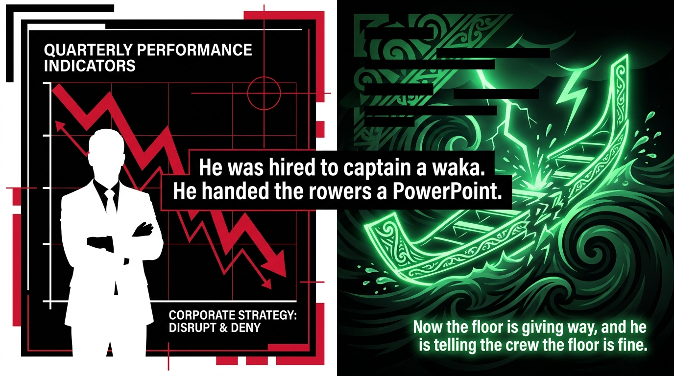 Imagine a man hired to captain a waka. He has never paddled a waka. He has managed a fleet of aircraft. He arrives in a pressed shirt, hands the rowers a PowerPoint presentation, and announces that morale is the problem — not the leak taking on water, not the navigator he just fired, not the fact that he cannot read the stars.