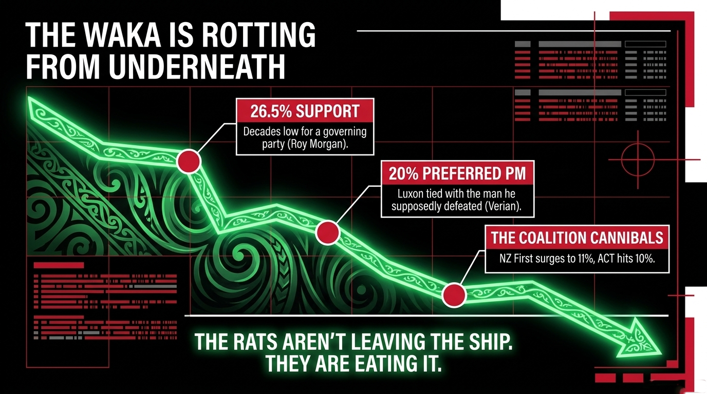 As confirmed by Roy Morgan, NZ First hit 11% and ACT 10% as National collapsed to 26.5%. National's voters are not going to Labour. They are parking with Peters and Seymour. As previously exposed in Aotearoa at the Crossroads on The Māori Green Lantern, Seymour's ACT Party operates as an ideological parasite — feeding on National's vulnerabilities to expand its own anti-Māori, anti-Treaty agenda. Peters feeds on the corpse. Seymour eats the bones. Luxon provides the carcass.