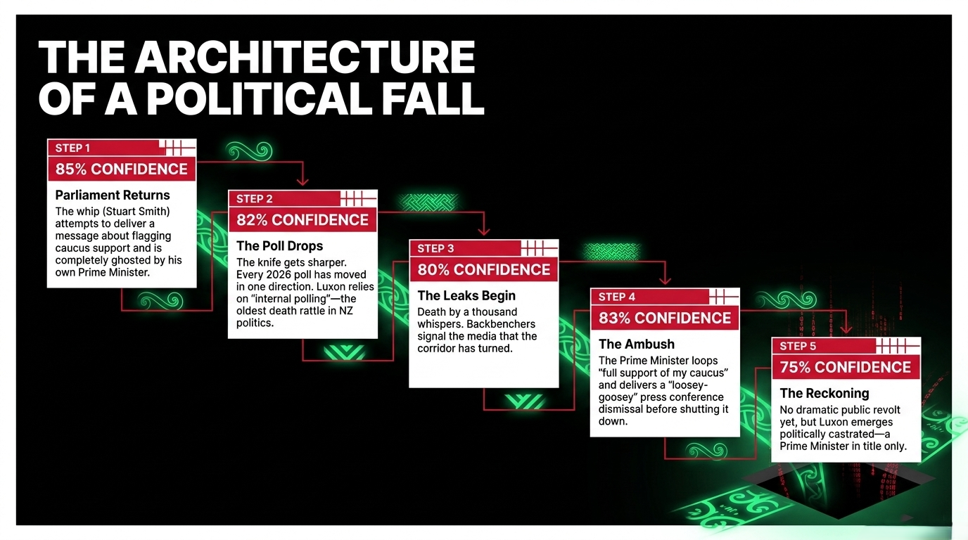 As confirmed to 1News by a National MP, "the numbers are probably there to unseat him" — but the preferred method is for Luxon to walk, not be pushed. As confirmed by Reuters via US News, any move "is unlikely to be a formal challenge or confidence vote initially." The dissenters are backbenchers with no named challenger — a mob without a captain, which gives Luxon 48–72 hours breathing room while still losing the war.
