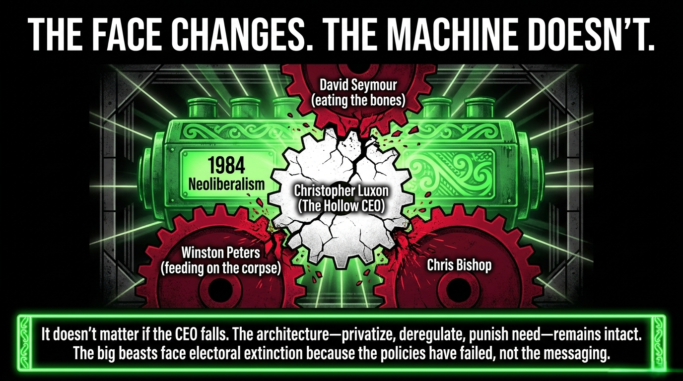 The National Party of Aotearoa is not simply led by a failing man. It is structurally committed to a failing ideology. The neoliberal consensus — privatise, deregulate, cut, reward wealth, punish need — has been failing Māori since Roger Douglas first picked up the axe in 1984. Luxon is simply its latest, most photogenic, most hollow ambassador. Nicola Willis, Chris Bishop, Erica Stanford — they are the same project in different suits, as documented in The NZ Neoliberal Pantomime. As documented in The Pantomime of the Dying Waka, they dress in borrowed feathers and hand whānau a government pamphlet when the taniwha comes. As confirmed by The Spinoff's horror poll analysis, the big beasts of National face electoral extinction because the policies have failed — not the messaging.