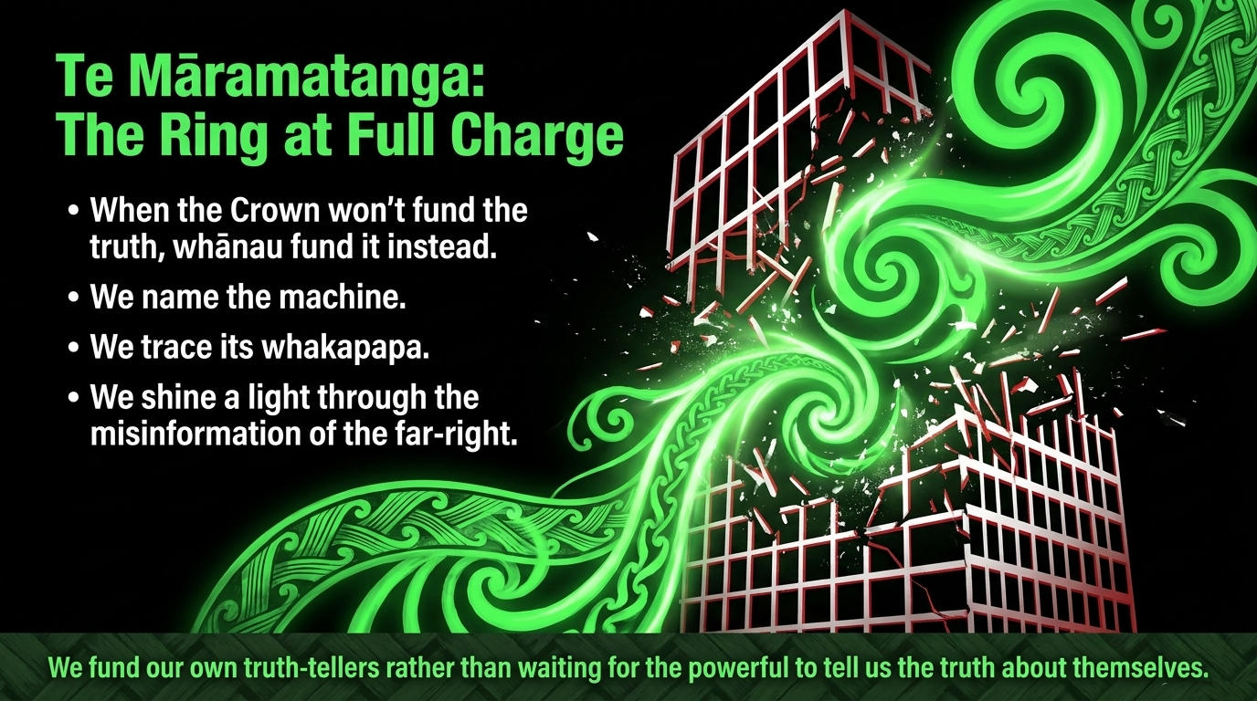 Ko tō mātou mahi: Name the machine. Trace its whakapapa. Fund the truth-tellers. And when November 2026 comes — remember every single name.