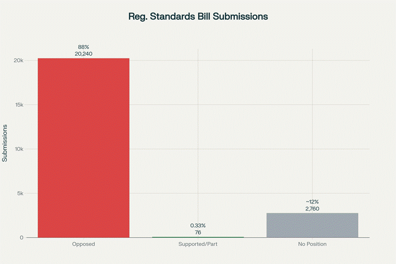 The bill’s lack of democratic legitimacy is stark. The Ministry for Regulation received 23,000 public submissions during consultation. Of these, 88% opposed the bill (approximately 20,240 submissions), 0.33% (76 submissions) supported or partially supported it, and about 12% had no clear position. Put bluntly: the government received near-universal public rejection and proceeded anyway.[1][7][8]