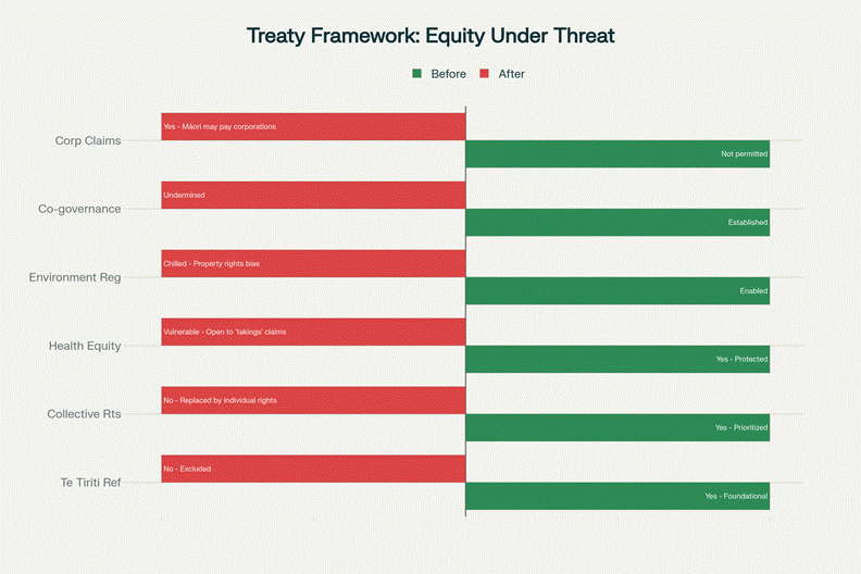 By excluding Te Tiriti from regulatory principles while elevating “equality before the law,” the bill institutionalises the Treaty’s demotion. Future governments cannot prioritise Te Tiriti principles without defending those choices against the RSB’s neoliberal filter. This constitutes a de facto rewriting of the Constitution, achieved without referendum or broad democratic consent.