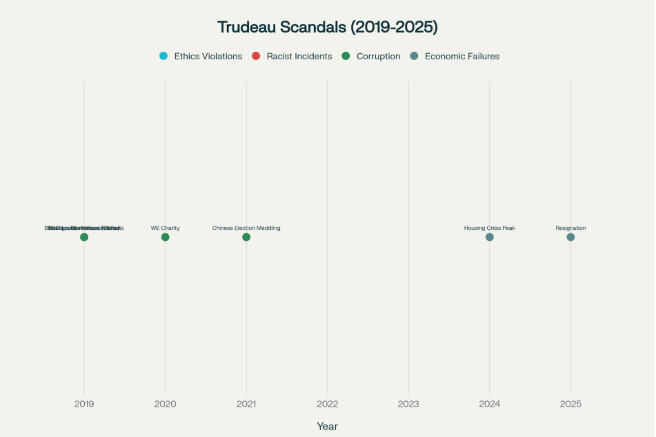 Timeline of major scandals during Justin Trudeau’s tenure as Canadian Prime Minister, from ethics violations to economic collapse.