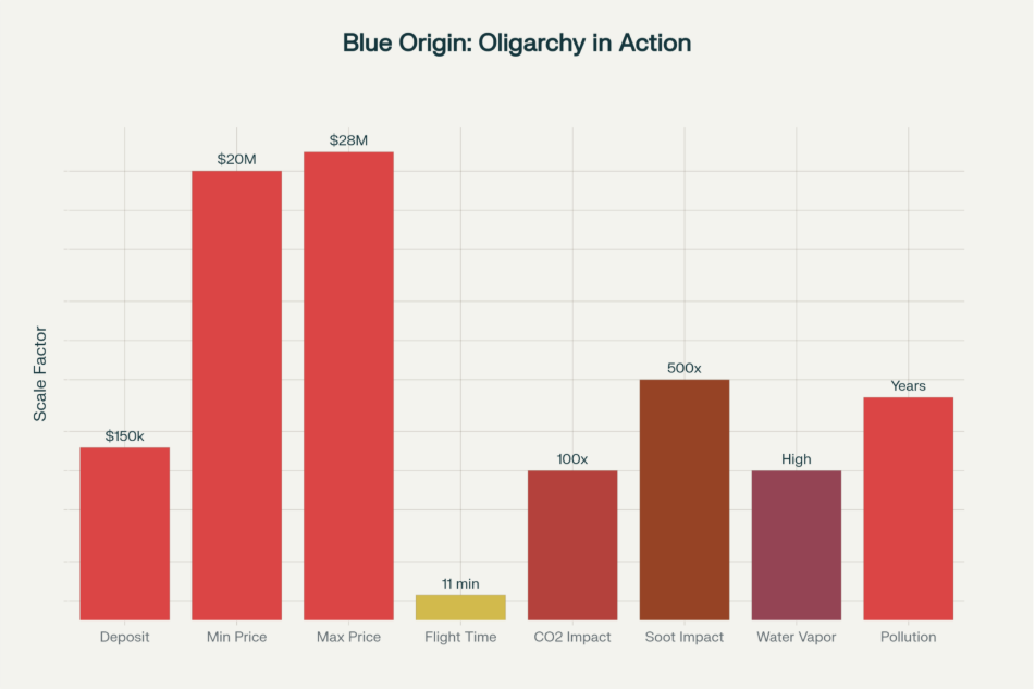 The astronomical financial and environmental costs of Blue Origin’s 11-minute space tourism flights, exposing billionaire excess and ecological harm.