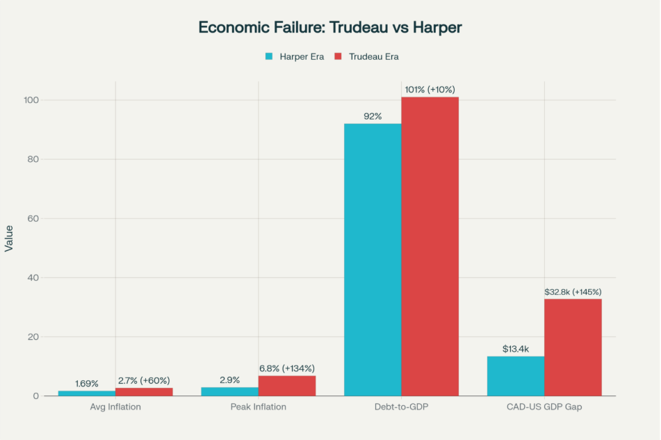 Justin Trudeau rode to power in 2015 promising economic growth and a revitalized middle class. He delivered the opposite. The Print (2024) documented that over nine years, Canada’s per capita GDP growth stagnated at 2.9% total—effectively flatlined. Meanwhile, The Print (2024) revealed the gap between Canadian and American per capita GDP exploded from $13,378 in 2015 to $32,766—a 144% widening. According to The Print (2024), Trudeau presided over the highest inflation in three decades, housing unaffordability that turned homeownership into a fantasy for entire generations, and a government debt-to-GDP ratio averaging 101% (peaking at 118% during COVID-19).