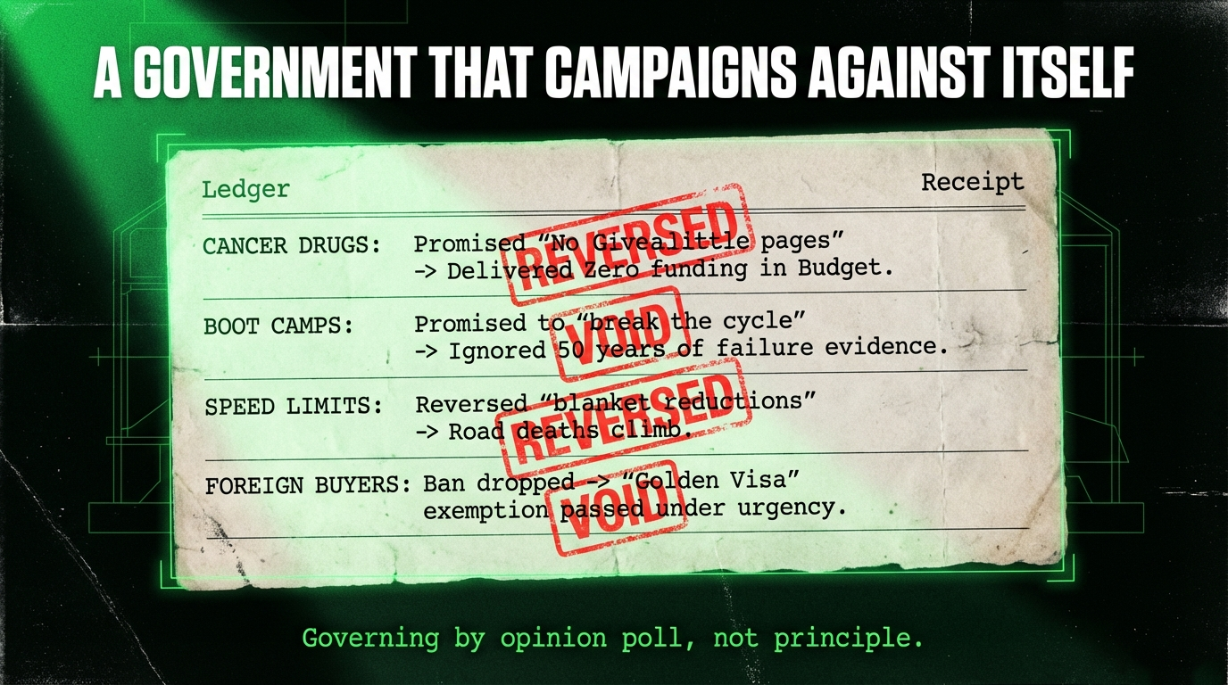Connection 1: Every backflip serves the same master. The cancer drugs were delayed to fund tax cuts. The boot camps serve law-and-order theatre to distract from housing failure. The Hauraki Gulf was opened to commercial fishers to satisfy industry donors. The speed limits were raised to perform "common sense" while road deaths climb. Section 7AA was repealed to deliver on ACT's ideological project to erase Treaty obligations from law. Every backflip lands in the same direction: toward corporate profit and away from collective wellbeing.