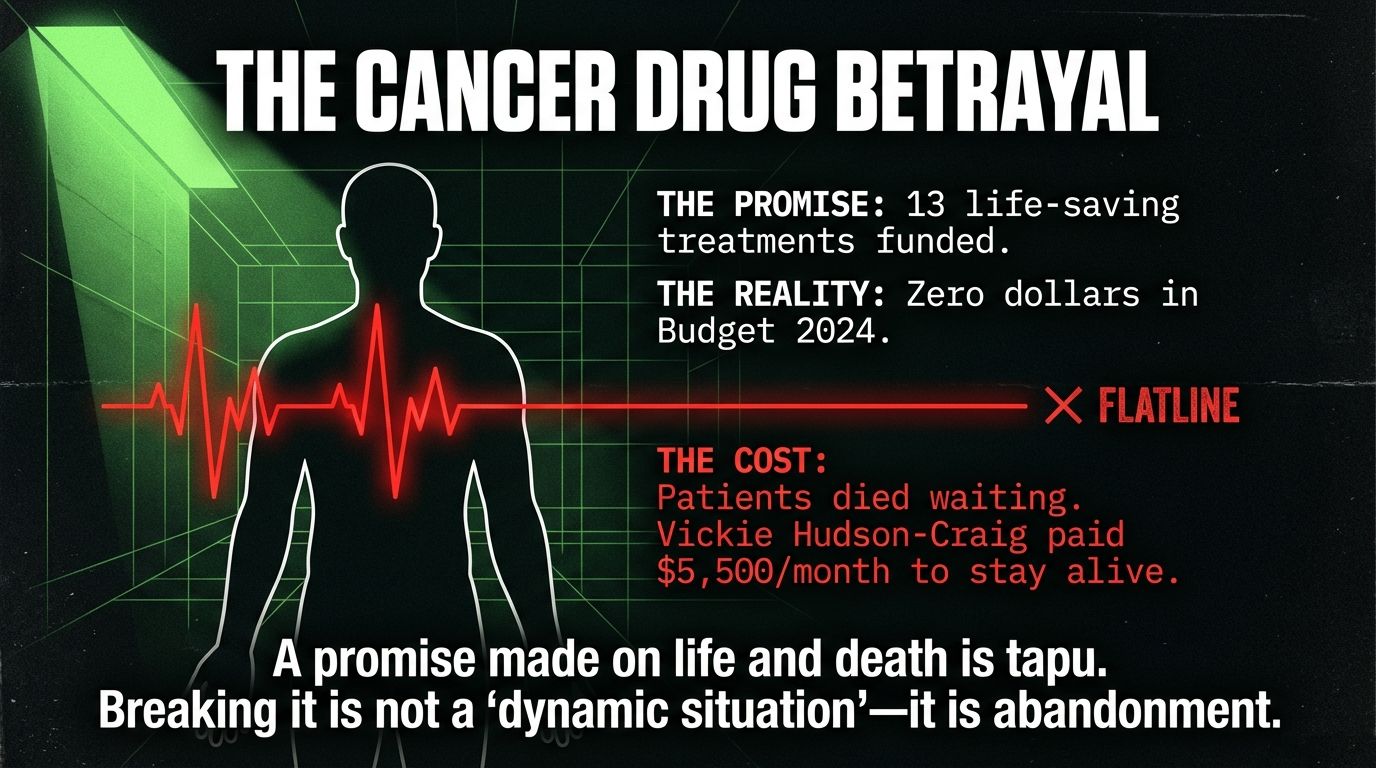 Budget 2024 contained zero dollars for these drugs. Not one cent. Vickie Hudson-Craig, who has melanoma tumours on her heart, was paying $5,500 per month to stay alive. She wept. Patient advocate Melissa Vining called it "absolutely despicable" and said: "There are people who will literally die as a result of that decision."