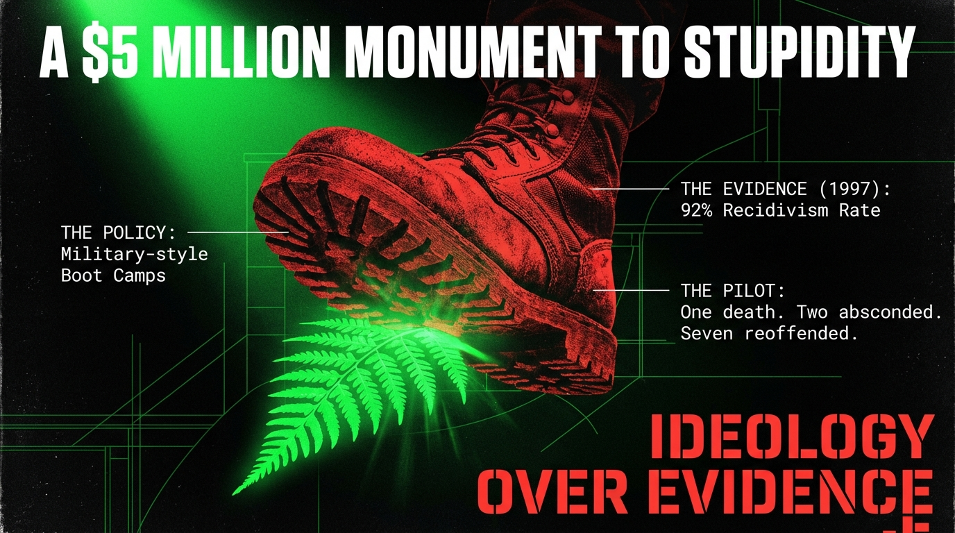 The solution: Defund boot camps immediately. Redirect all funding to Te Pae Oranga and kaupapa Māori youth justice programmes with proven outcomes. Invest in housing, education, mental health, and whānau support — the actual drivers of youth offending. As covered in "The Colosseum of Kingsland" on The Māori Green Lantern, this government consistently chooses spectacle over substance, bread-and-circuses over genuine care.