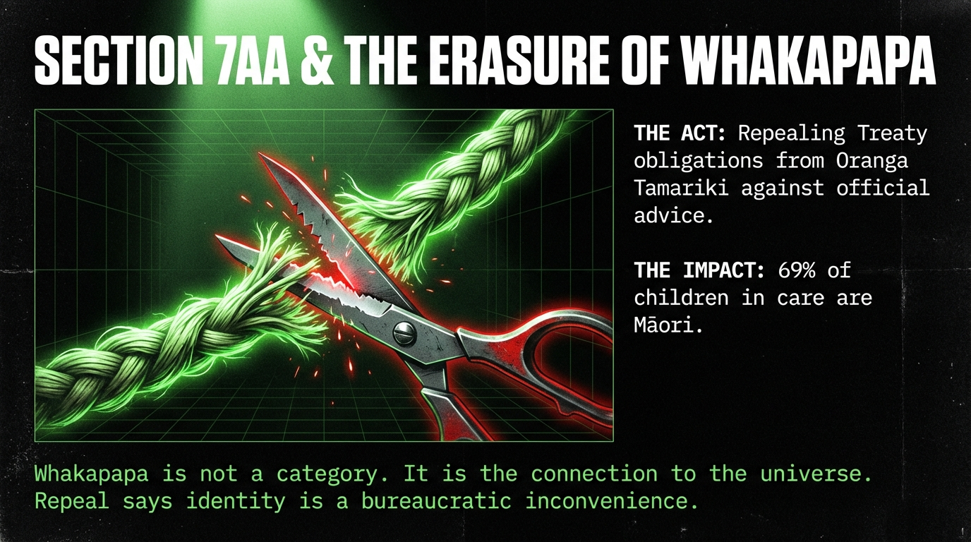 The tikanga violation: In te ao Māori, whakapapa is not a bureaucratic category. It is the umbilical cord connecting a child to the universe — to atua, to tūpuna, to whenua, to whānau. To sever that cord is not a policy decision. It is an act of spiritual violence. The concept of whāngai — where children are raised by wider kin while maintaining connection to birth parents — has existed for centuries. The Western system of adoption severs those connections. Section 7AA was the acknowledgement that Māori children need Māori solutions. Its repeal says: your whakapapa is dispensable; your culture is optional; your identity is a bureaucratic inconvenience. As documented in The Māori Green Lantern's "Whakapapa — The Layers They Buried", this repeal is not an isolated act — it is part of a coordinated demolition of every structure designed to protect Māori existence within Crown systems.