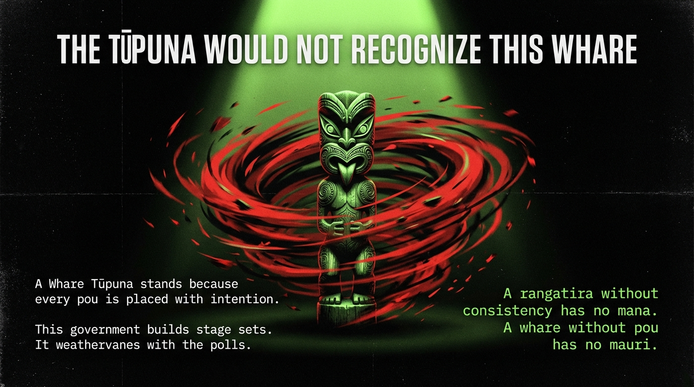 In te ao Māori, this is the ultimate violation of mana. A rangatira who cannot hold their word has no mana. A whare with no pou has no mauri. A government with no consistency has no legitimacy.