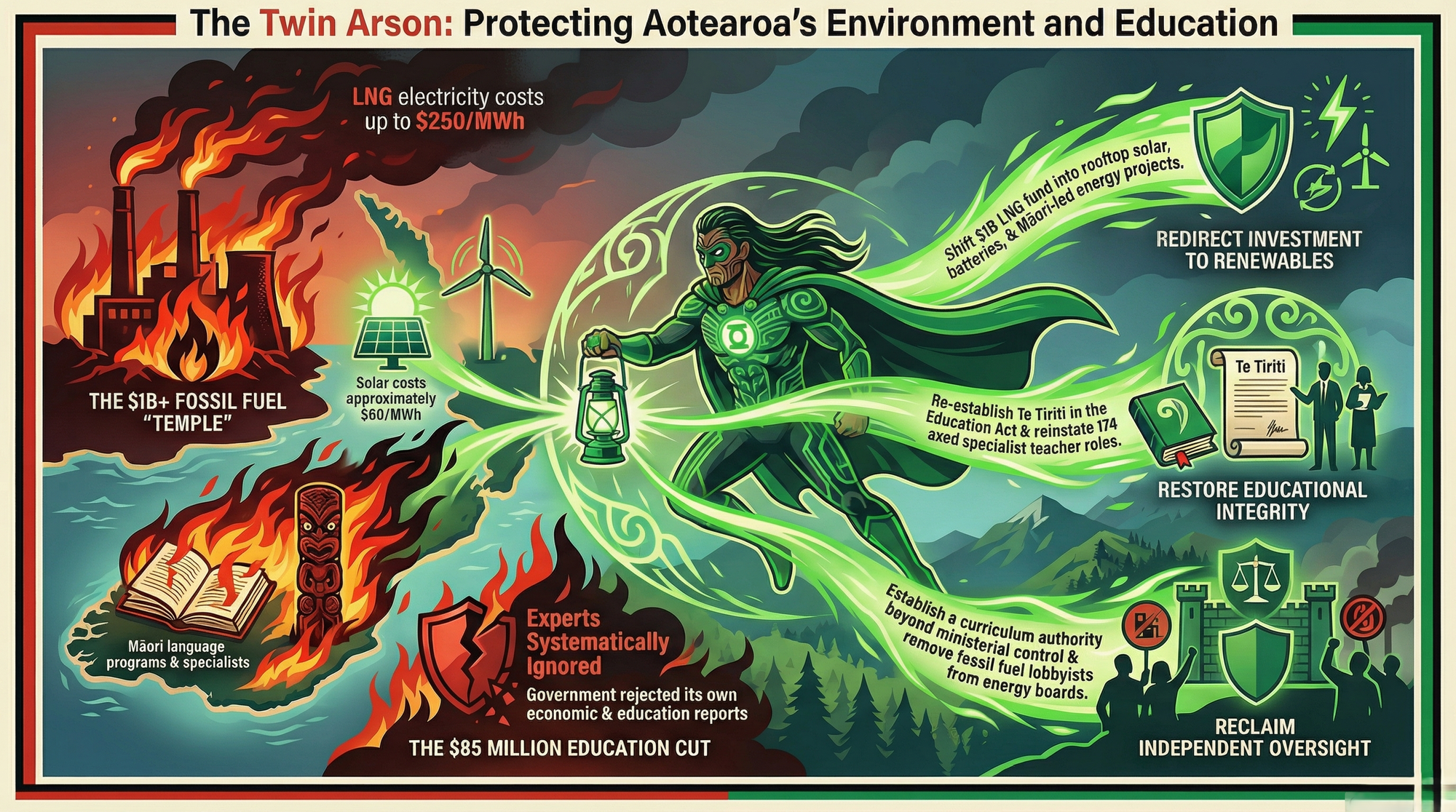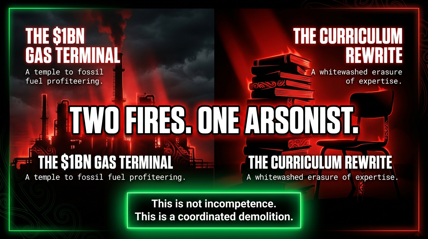 Picture two fires burning simultaneously across Aotearoa this week. In Taranaki, Christopher Luxon lights the match on a billion-dollar liquefied natural gas terminal that his own independent experts told him makes "no economic sense" — a temple to fossil fuel profiteering built on the backs of every household's power bill. In Wellington, a former Ministry of Education staffer reveals that the government's curriculum rewrite deliberately ignored subject experts and teachers, replacing evidence-based education with ideology dictated by people who had "previous relationships with the minister."