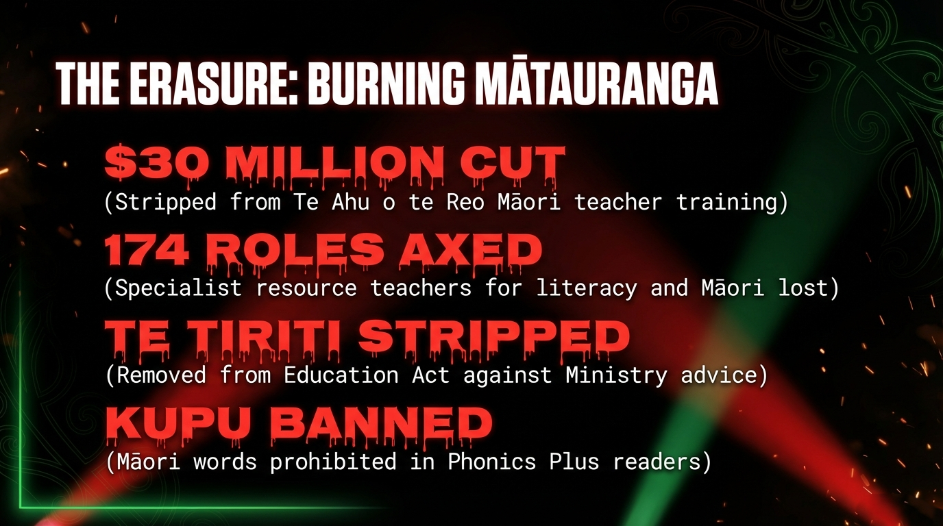 Rangatiratanga — the authority of Māori to determine their own affairs — is the ultimate target. Removing Te Tiriti from the Education Act, stripping tikanga Māori from curriculum, banning kupu Māori from children's books, and defunding te reo programmes are not isolated "policy decisions." They are a coordinated assault on the right of tangata whenua to see themselves, their language, and their knowledge reflected in the education of their own children.