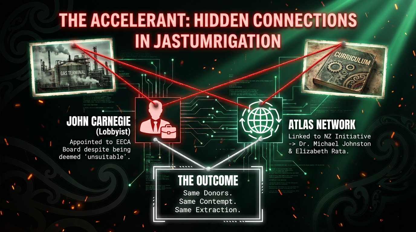 The curriculum rewrite is being shaped by New Zealand Initiative fellows connected to the Atlas Network. The Taxpayers' Union — also Atlas-linked — has been described as weaponising astroturf campaigns for ACT. As I documented in "The Chickens Come Home to Roost", this coalition represents "the fulfilment of this neoliberal dream: a triumvirate of corporate puppets led by Luxon (the 'run-of-the-mill corporatist'), Peters (the 'garden-variety populist'), and Seymour (the '10-a-penny libertarian')." The same international neoliberal network that wants to extract fossil fuel profits from Aotearoa also wants to erase Indigenous knowledge from schools — because educated, culturally grounded Indigenous people resist extraction.