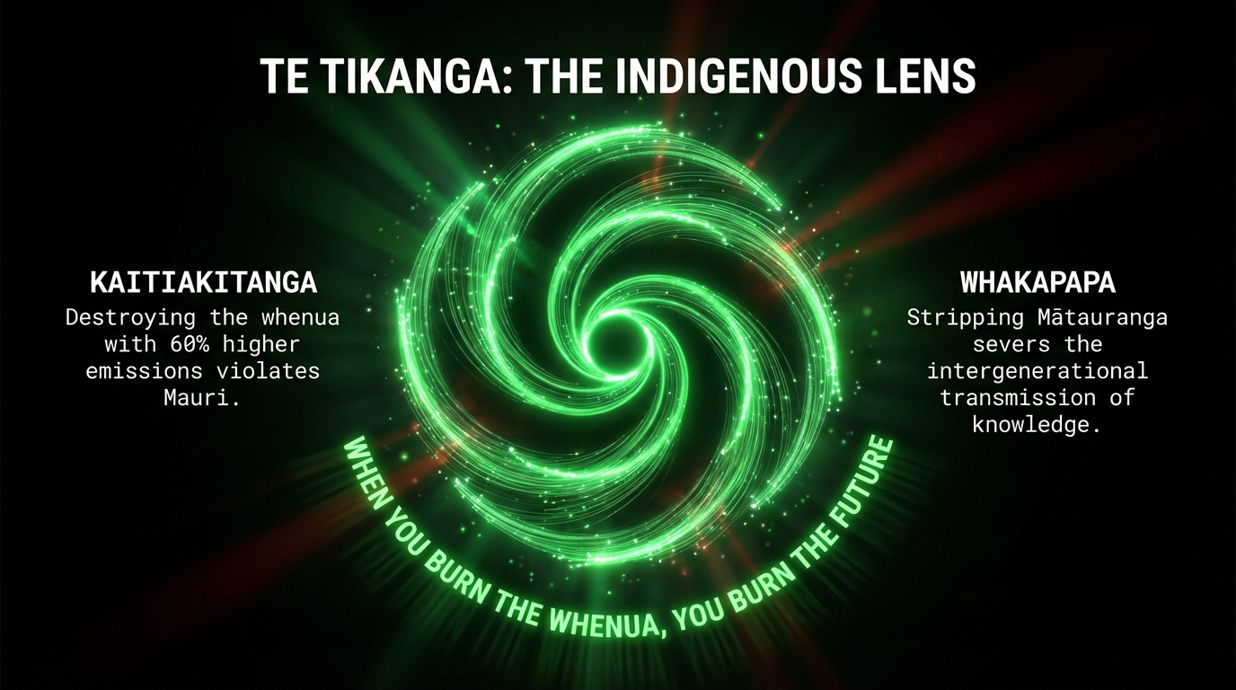 The mauri of Papatūānuku and the mauri of our tamariki are not separate. They are one whakapapa. When you burn the whenua, you burn the future. When you erase mātauranga, you sever the roots that hold the tree upright.