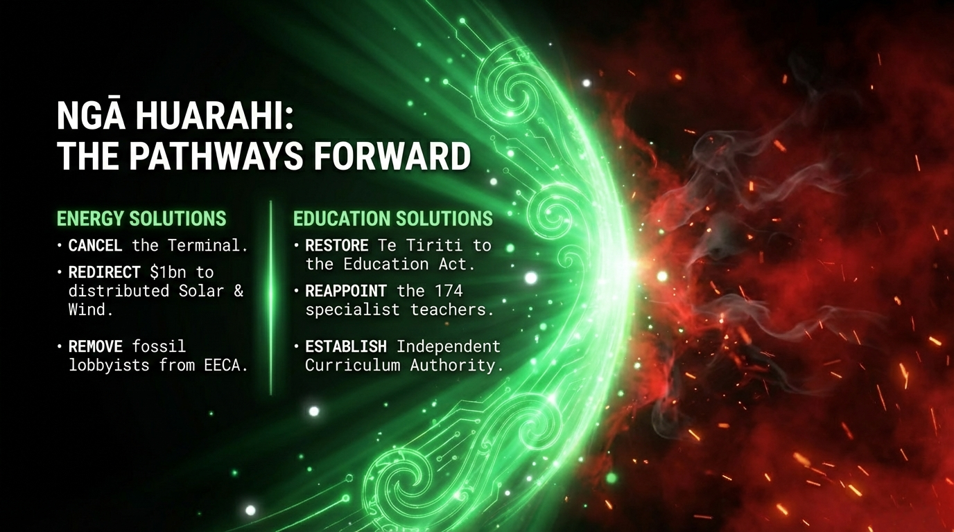 This is a government that takes a billion dollars from whānau to build a gas temple while cutting $85 million from the education of their tamariki. A government that appoints fossil fuel lobbyists to renewable energy boards and Atlas Network ideologues to curriculum writing teams. A government that instructs officials not to write things down "so it's not OIA-able" and keeps its fossil fuel shortlists "commercially sensitive." A government that rejects its own experts on energy AND education because expertise inconveniences the donors.