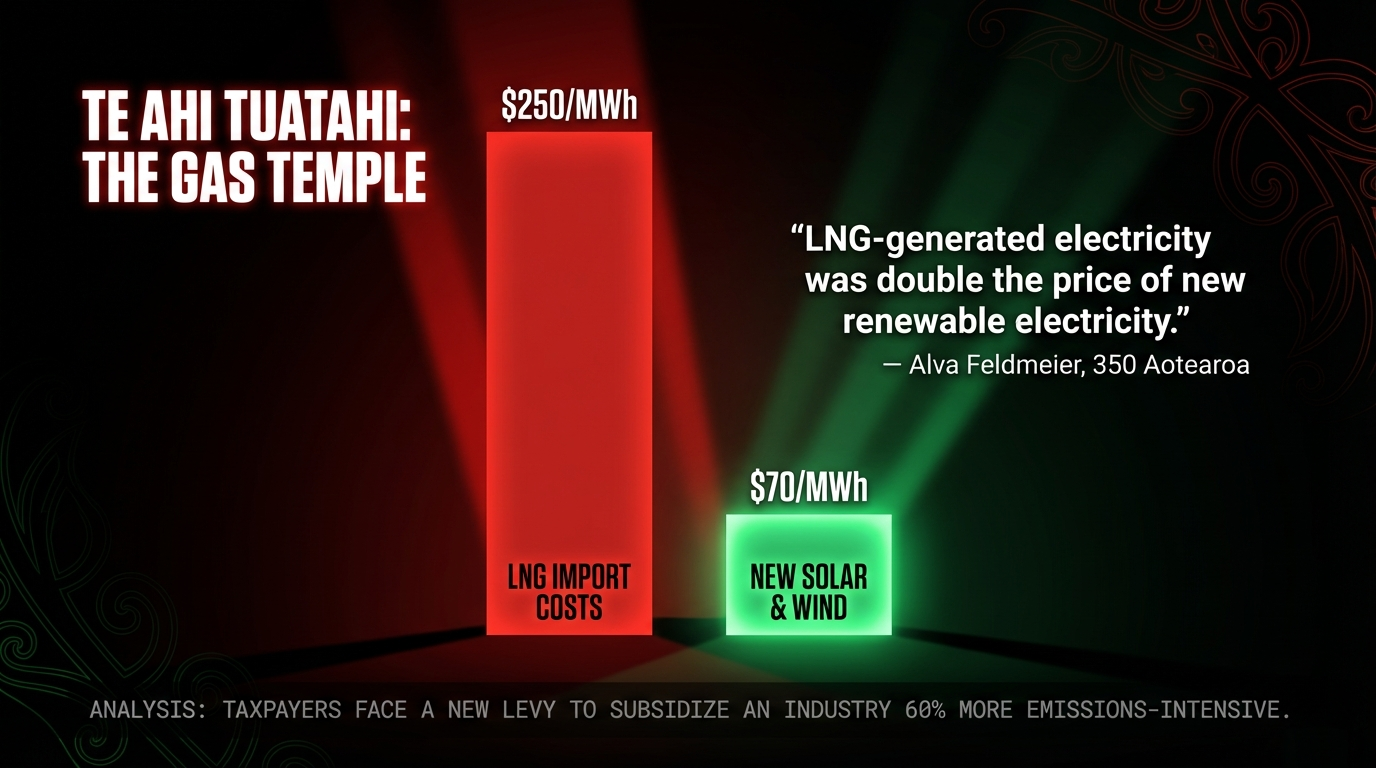 The government's own fact sheet reveals the grotesque mathematics: LNG-generated electricity will cost between $200 and $250 per megawatt hour. New solar costs around $60/MWh. New wind around $70/MWh. As climate advocacy group 350 Aotearoa's Alva Feldmeier stated plainly: "LNG-generated electricity was double the price of new renewable electricity". A billion dollars buys an extraordinary amount of solar panels and batteries, as Labour leader Chris Hipkins correctly observed.