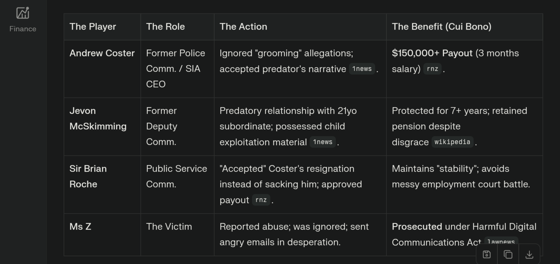 - The “Honourable” Fallacy: Roche described Coster’s resignation as “extremely honourable”. There is no honour in taking a payout while your victim stands trial. This language attempts to restore Coster’s mana at the expense of the truth.