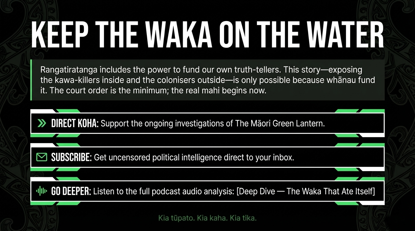 Every koha signals that rangatiratanga includes the power to fund our own truth-tellers. The Māori Green Lantern will keep wielding the taiaha — exposing the kawa-killers inside and outside the movement — as long as whānau keep this waka on the water.