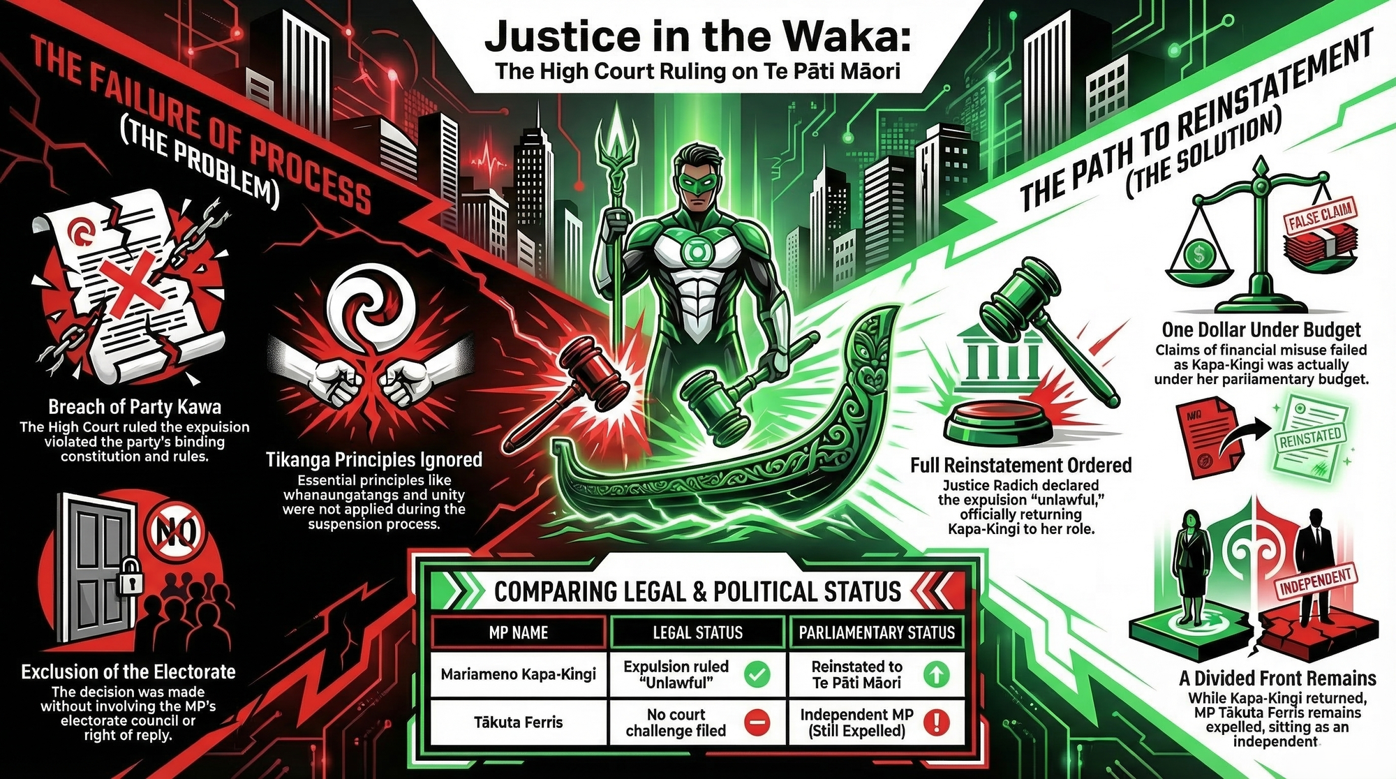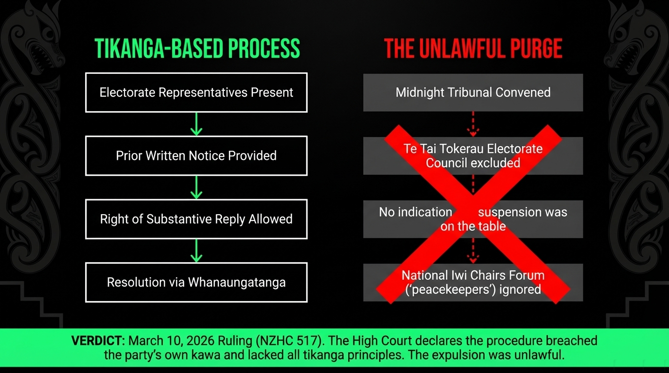 As RNZ reported, lawyer Mike Colson KC argued before Justice Paul Radich that the party's National Council did not have the power to expel Kapa-Kingi, and that the entire process was conducted in breach of both the dispute resolution procedures and tikanga itself. The High Court ultimately agreed — Justice Radich ruled, as RNZ confirmed, that the resolutions to suspend and expel Kapa-Kingi were "in breach of the party's kawa" and therefore unlawful.