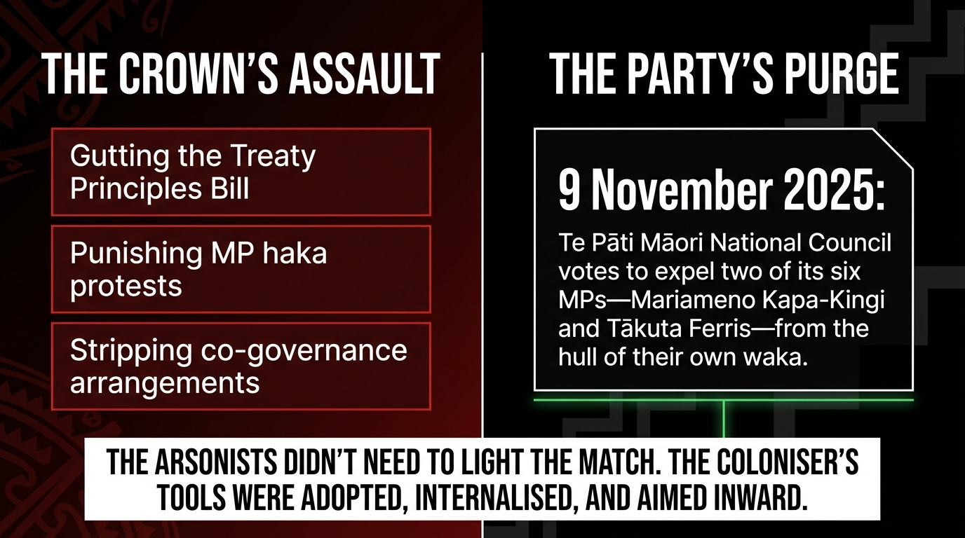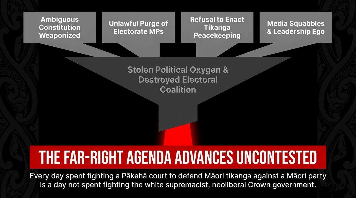Let that land. The Māori Party — the movement founded to protect tikanga, to centre te ao Māori, to weaponise mātauranga against colonial erasure — had its own actions declared unlawful by a Pākehā court because it breached its own tikanga processes. The Crown did not need to lift a finger.