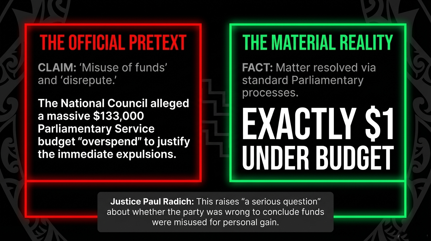 The financial pretext crumbles under examination. 1News revealed that the so-called "overspend" — a disputed $133,000 Parliamentary Service budget matter — was resolved through Parliamentary Service processes, with Kapa-Kingi finishing the year one dollar under budget. Justice Radich himself noted this raised "a serious question" about whether the party was wrong to conclude she misused funds for personal gain.